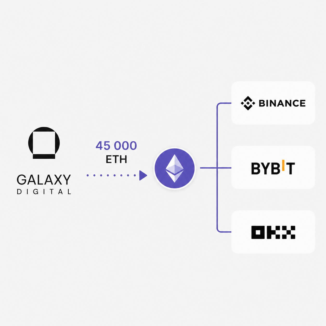 По данным аналитиков, два кошелька, связанные с Galaxy Digital, в течение примерно 15 часов 28 апреля отправили примерно 45 000 ETH на три крупные биржи — Binance, Bybit и OKX. Общий объём перевода оценивают более чем в $100 млн при текущих ценах.