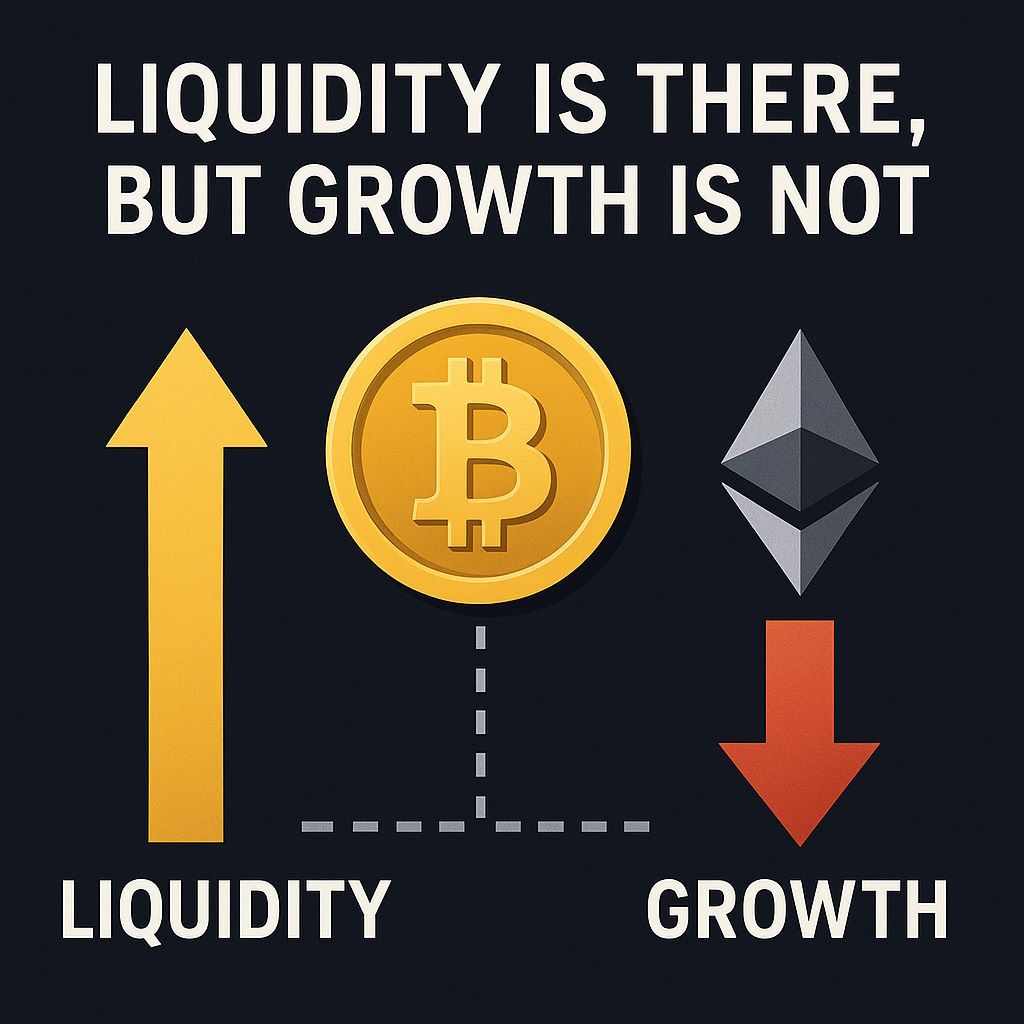Это расхождение — между ростом денежной массы и отсутствием притока средств в криптовалюты — и формирует ключевой парадокс текущего рынка.