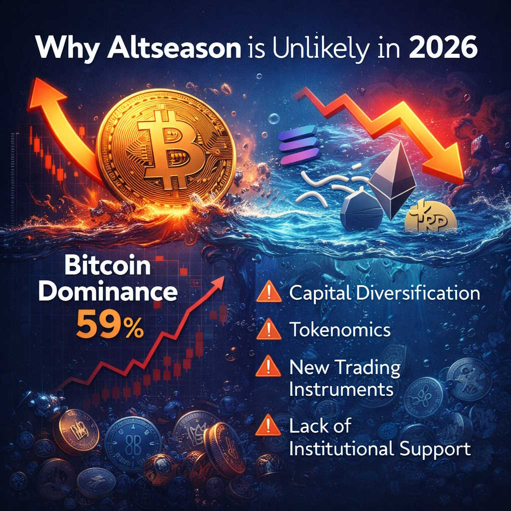 Альтсезон в 2026 году маловероятен по ряду объективных причин: доминирование Bitcoin сохраняется, капитал распыляется между миллионами токенов, институциональные средства концентрируются в крупных активах, а рынок токенов испытывает давление разблокировок. Все эти факторы создают среду, в которой масштабный рост альткоинов одновременно по всему рынку крайне затруднён.